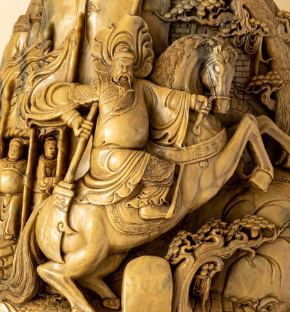 This piece of exquisitely carved and lighter-hued jade is reminiscent of the 3rd century BC, during the time of China’s first emperor, Qin Shi Huang, and his terracotta army. The inlays also showcase a Huangshan Pine tree, as it is native to the mist-shrouded mountain of the same name, and a staple in Chinese historical culture. Jade has been part of ancient burial rites throughout China’s long and storied history, with this piece having an ancient war-horse being front and centre. The horse symbolises pure male strength (yang), and has been regarded as a more potent form of power than the dragon, until late BC when the culture began revering the dragon as a more pure form of strength and power.